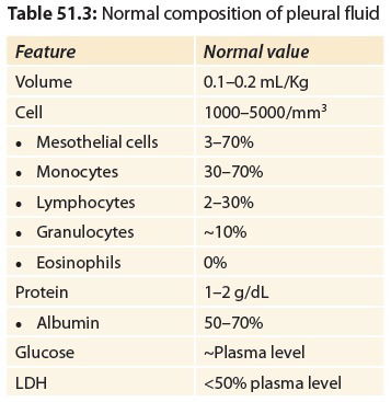 Normal composition of pleural fluid is mentioned in Table 51.3.