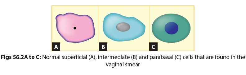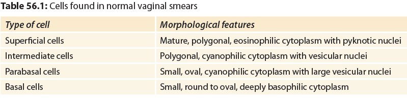 The cytological features and appearance of cells in normal vaginal smear are shown in Table 56.1 and Figures 56.2A to C, respectively.