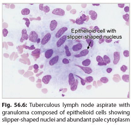 •• Smears are cellular and composed of epithelioid cells in cohesive clusters forming granulomas.