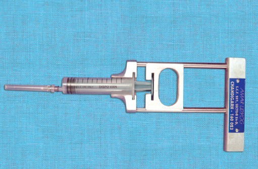Fig. 56.1: Cameco syringe pistol (syringe holder) with disposable 5 cc syringe and 22G needle