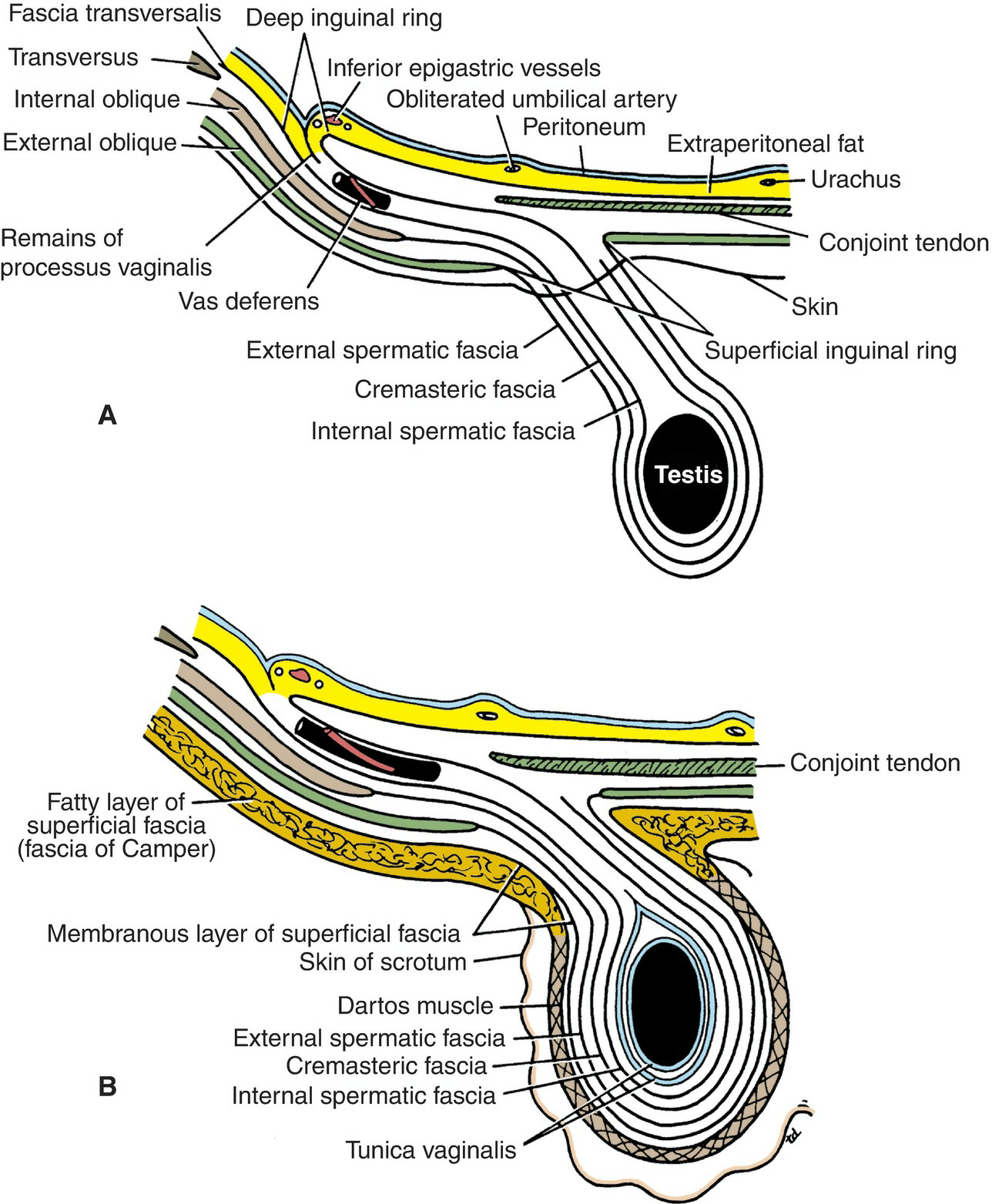 Figure 6.11 A. Continuity of the different layers of the anterior abdominal wall with coverings of the spermatic cord. B. The skin and superficial fascia of the abdominal wall and scrotum have been included, and the tunica vaginalis is shown.