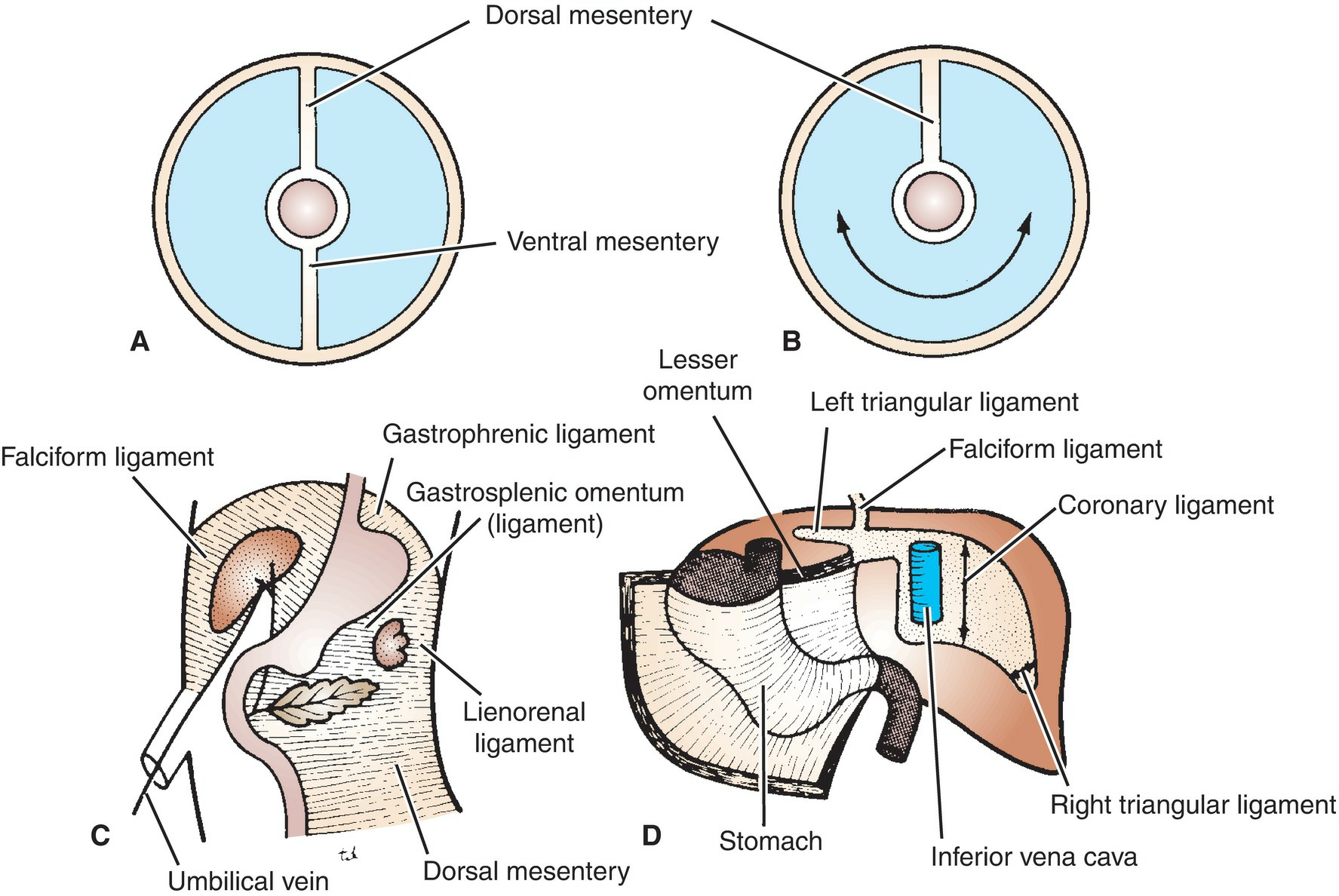 The peritoneal ligaments are developed from the ventral and dorsal mesenteries. The ventral mesentery is formed from the mesoderm of the septum transversum (derived from the cervical somites, which migrate downward). The ventral mesentery forms the falciform ligament, the lesser omentum, and the coronary and triangular ligaments of the liver (see Fig.7.18C, D).