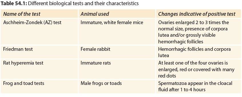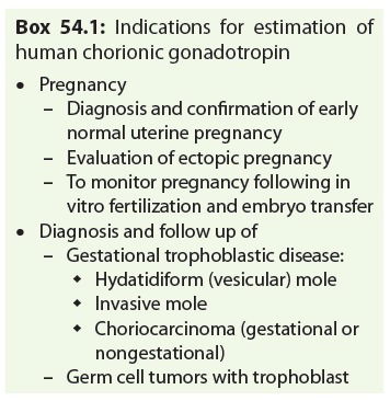 Pregnancy test detects human chorionic gonadotropin(hCG), which is a hormone secreted by the viable placental tissue. The test may be employed for either qualitative or quantitative estimation of hCG. The term pregnancy test is a misnomer, as it has other diagnostic indications also. Indications for estimation of human chorionic gonadotropin are listed in Box54.1.