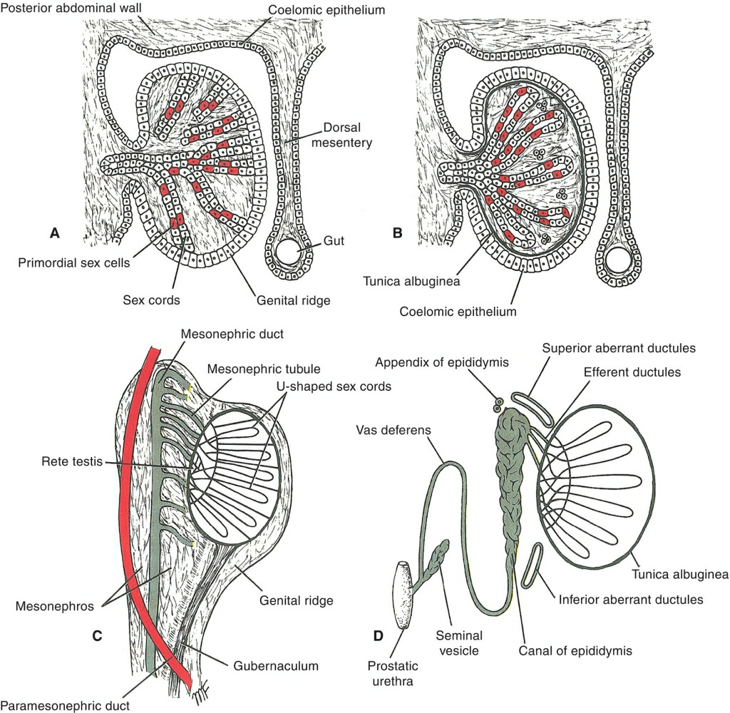 Figure 6.30 The formation (A), development (B,C), and fate (D) of the testis and its ducts.